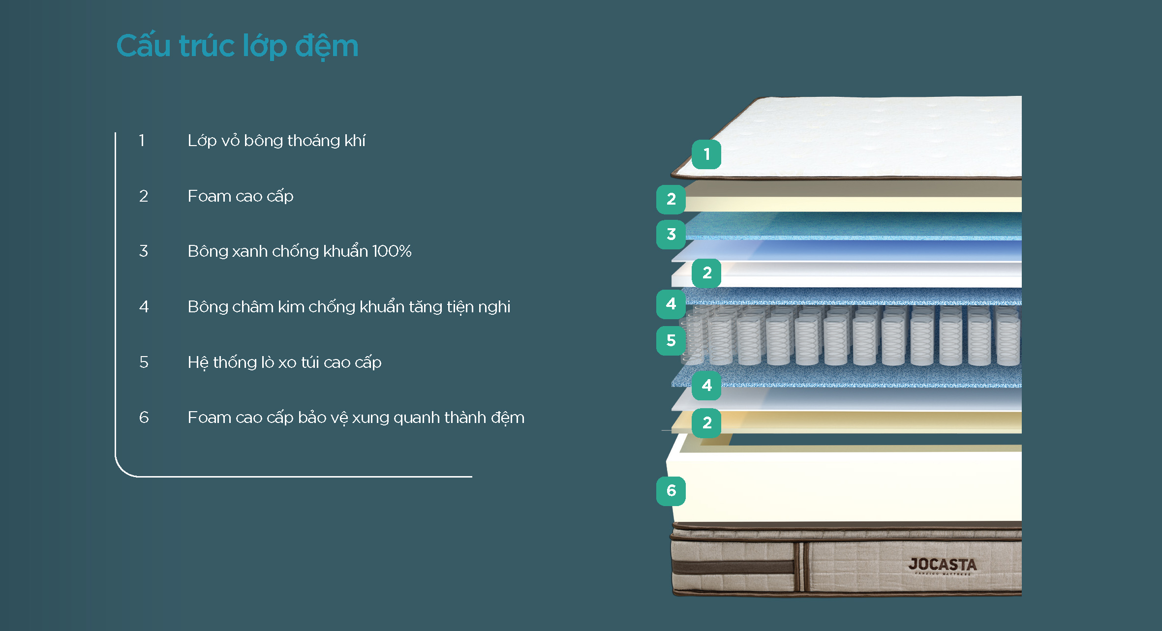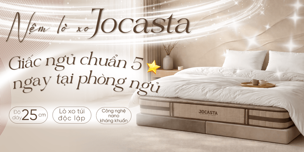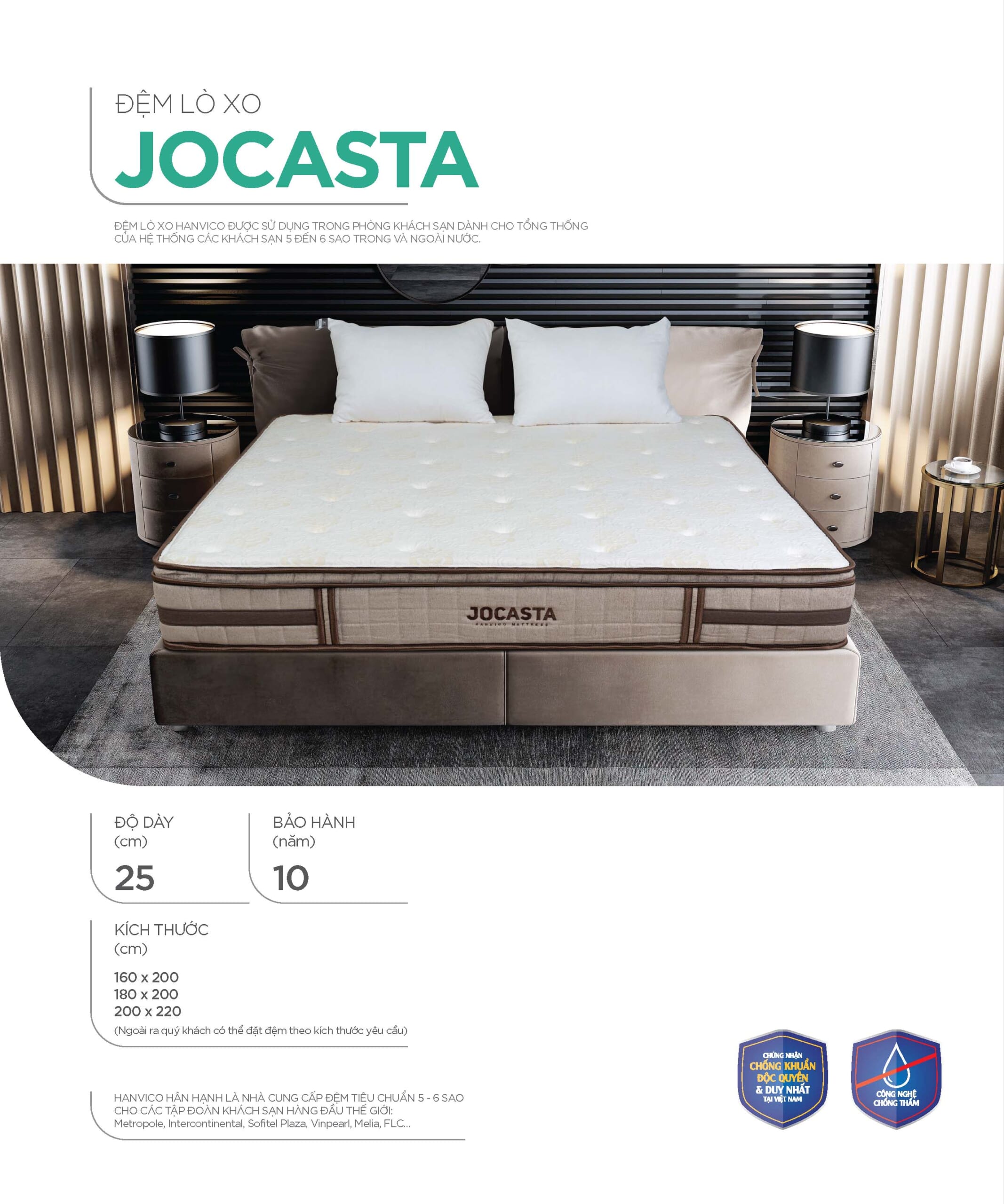 Đệm lò xo Jocasta là dòng sản phẩm cao cấp thuộc hệ thống sản phẩm dành cho gia đình của Hanvico, được tin dùng bởi các hệ thống khách sạn 3 đến 5 sao tiêu chuẩn quốc tế. Với sự kết hợp tinh tế giữa công nghệ lò xo túi và các lớp tiện nghi kháng khuẩn, Jocasta mang lại trải nghiệm nghỉ ngơi chuẩn khách sạn ngay tại không gian sống của bạn.