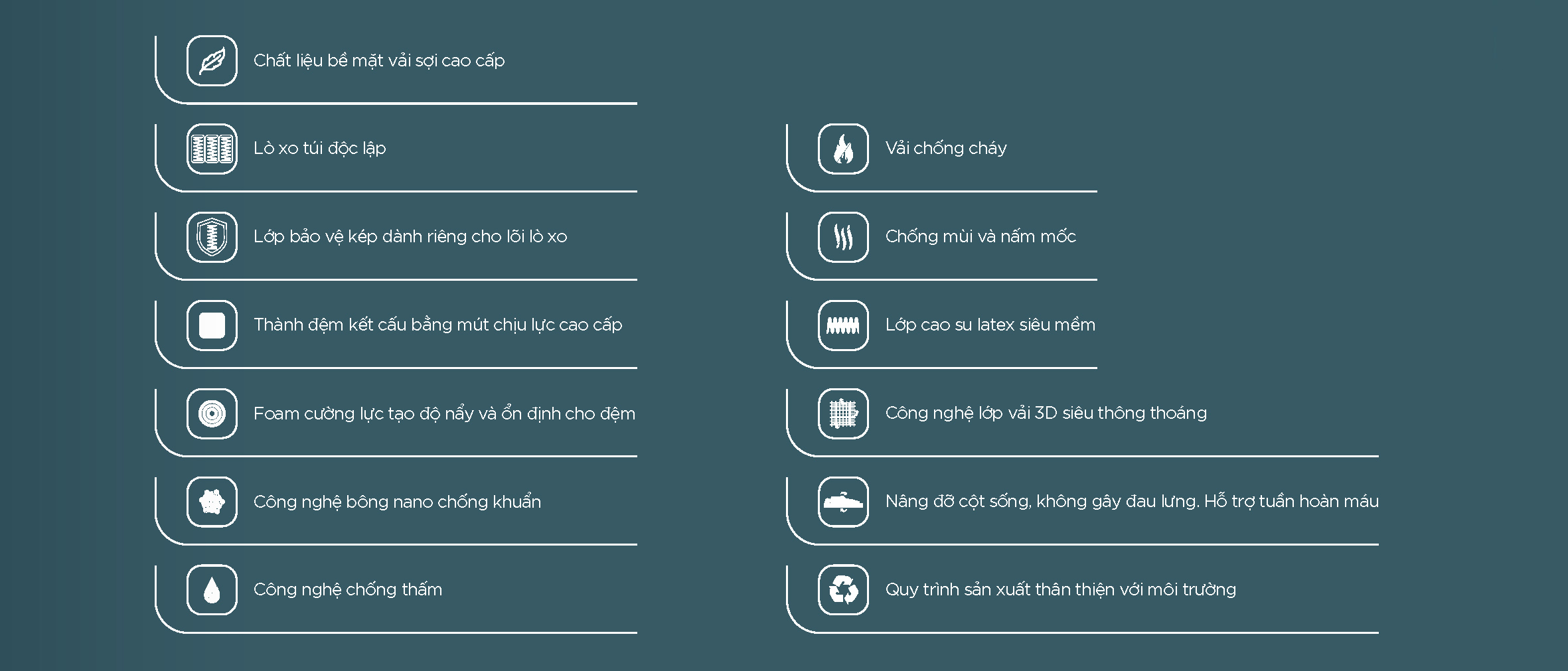 1. Hệ thống lò xo túi độc lập bền bỉ Sử dụng hệ thống lò xo túi độc lập giúp nâng đỡ cột sống tối ưu, không gây đau lưng và phù hợp với mọi tư thế nằm. Kết cấu này giúp hạn chế tối đa sự truyền rung động, đảm bảo giấc ngủ không bị gián đoạn khi người nằm cạnh thay đổi tư thế.