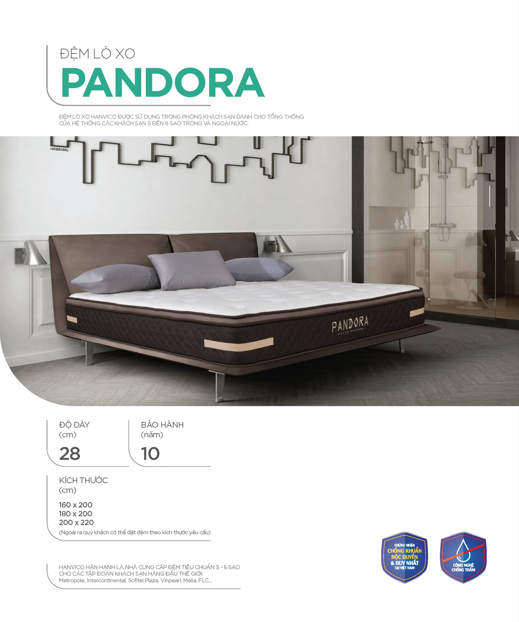 Đệm lò xo Pandora là dòng sản phẩm cao cấp của Hanvico, được tin dùng bởi các hệ thống khách sạn 3 đến 5 sao trong và ngoài nước. Với thiết kế hiện đại và hệ thống lò xo túi độc lập, Pandora mang đến sự kết hợp hoàn hảo giữa độ bền bỉ và khả năng chăm sóc giấc ngủ chuyên sâu.
