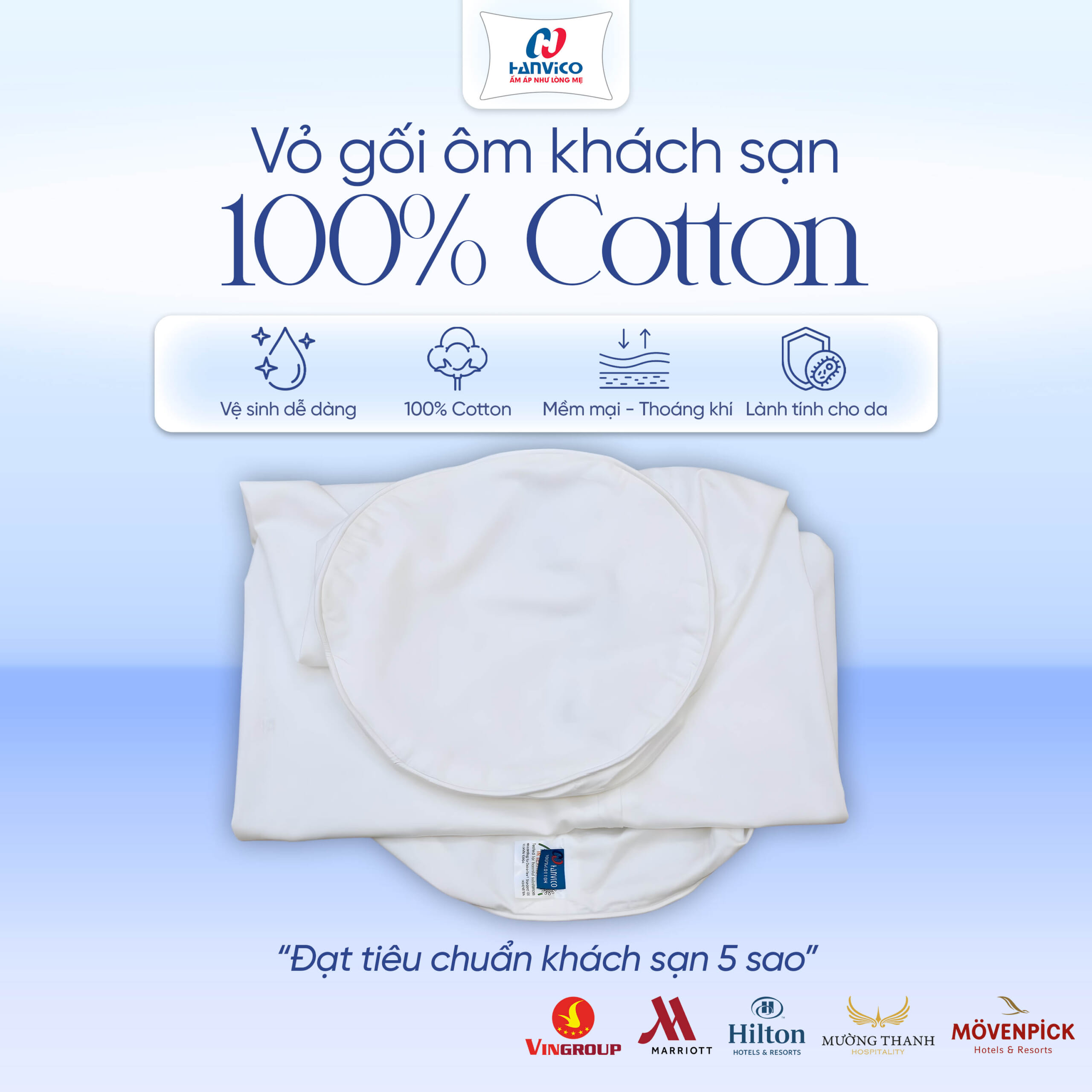 Mọi sản phẩm vỏ gối Hanvico chính hãng đều có tem mark đầy đủ và đã được kiểm nghiệm theo tiêu chuẩn Oeko-Tex Standard 100. Điều này đảm bảo vải không chứa các chất độc hại, tuyệt đối an toàn cho làn da nhạy cảm và hệ hô hấp.
